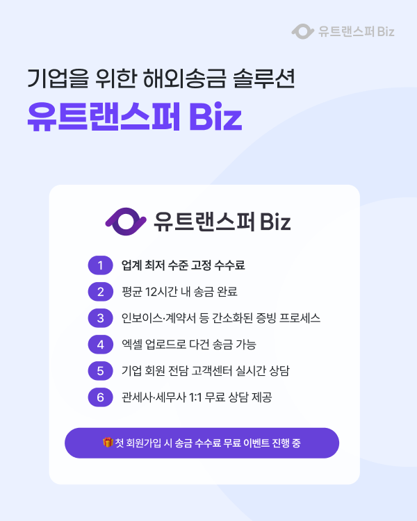 📌 유트랜스퍼Biz 가입시, 첫 송금 수수료 무료 이벤트 중