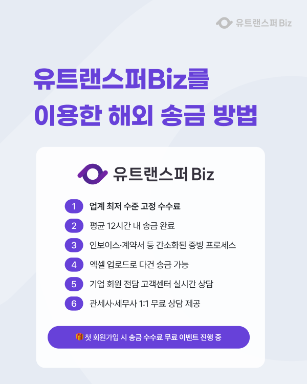 📌 유트랜스퍼Biz 가입시, 첫 송금 수수료 무료 이벤트 중