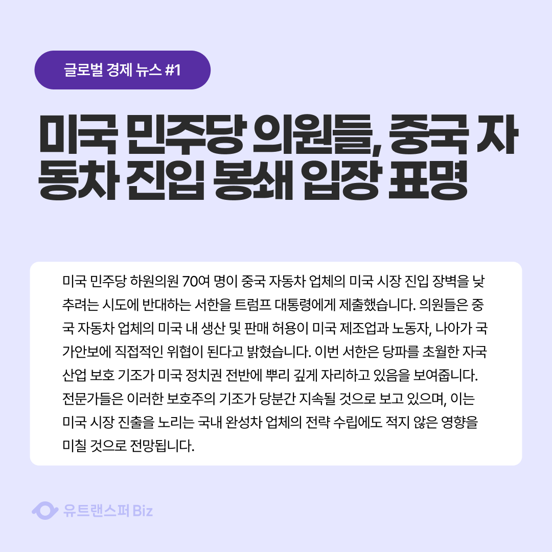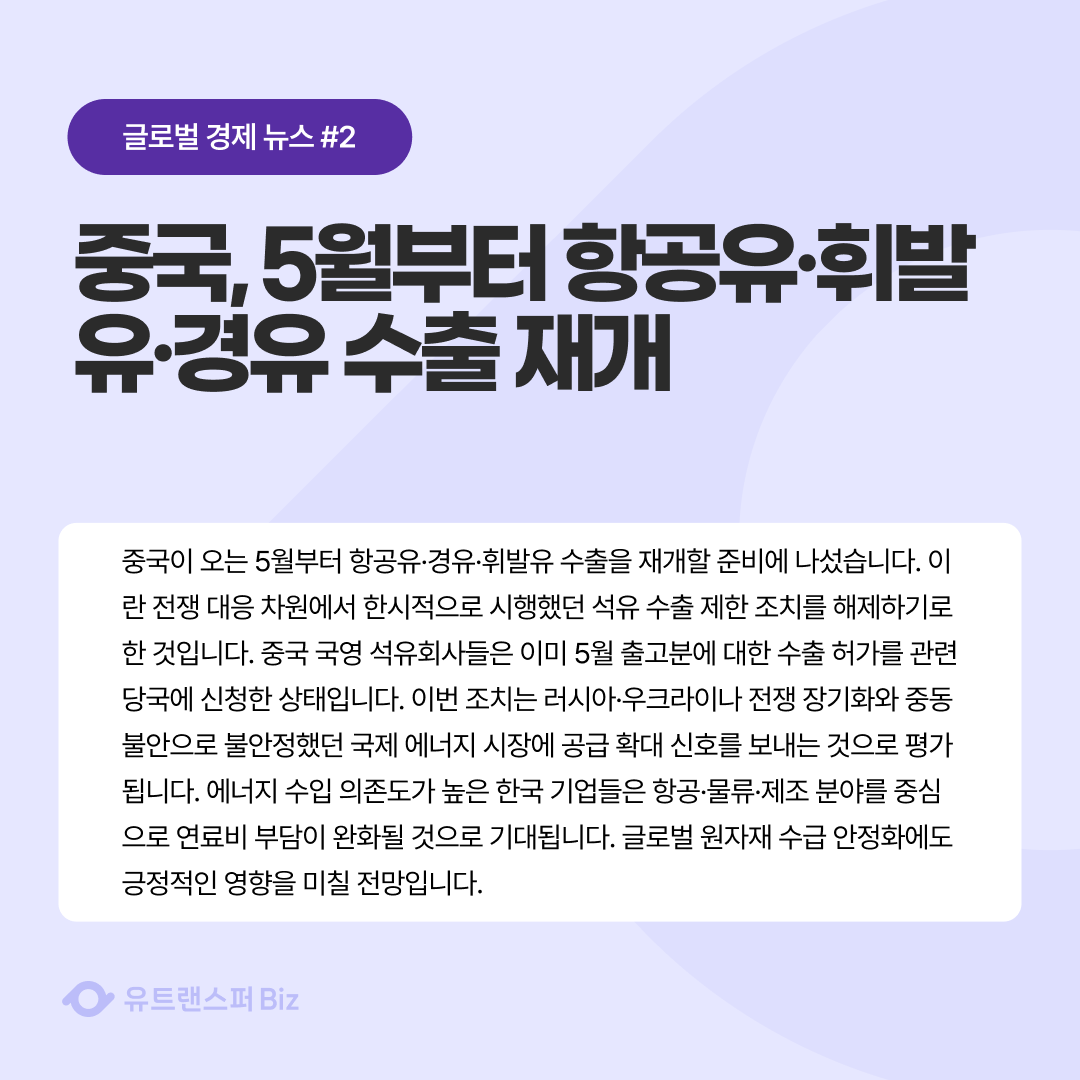 오늘은 미국의 자동차 산업 규제 동향, 중국의 석유 수출 재개 소식,